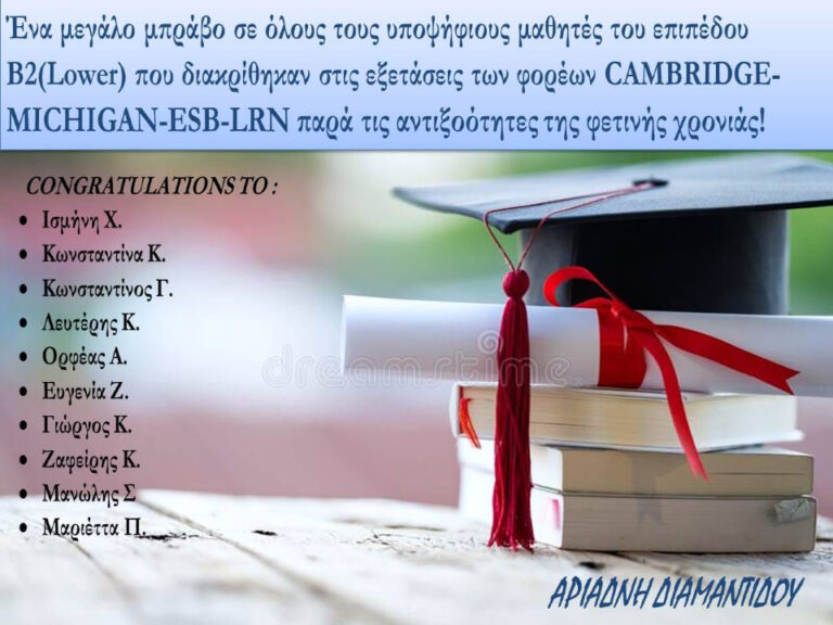 Συγχαρητήρια σε όλους τους μαθητές μας που πέρασαν με επιτυχία τις εξετάσεις επιπέδων Β1-Β2-C1-C2 των φορέων (Michigan –...