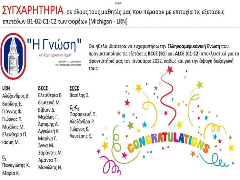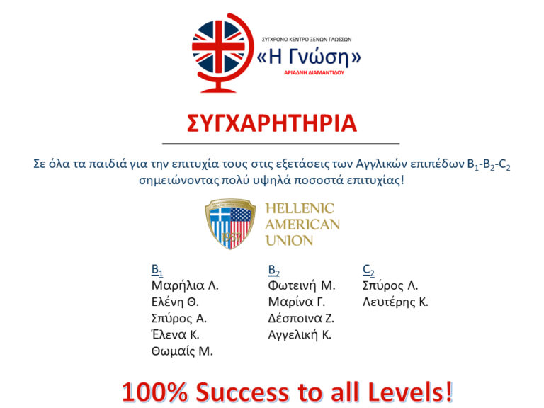 ΣΥΓΧΑΡΗΤΗΡΙΑ Σε όλα τα παιδιά για την επιτυχία τους στις εξετάσεις των Αγγλικών επιπέδων Β1-Β2-C2 σημειώνοντας πολύ υψηλά...