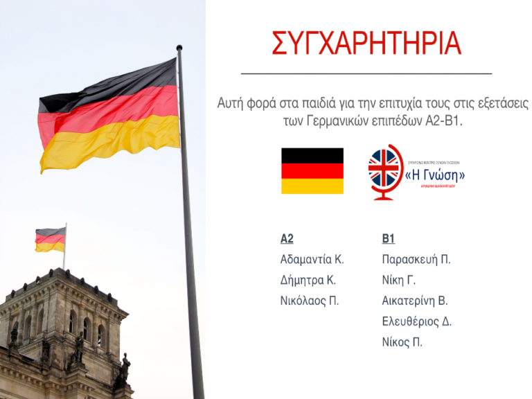 ΘΕΡΜΑ ΣΥΓΧΑΡΗΤΗΡΙΑ Αυτή φορά στα παιδιά για την επιτυχία τους στις εξετάσεις των Γερμανικών επιπέδων Α2-Β1. ...